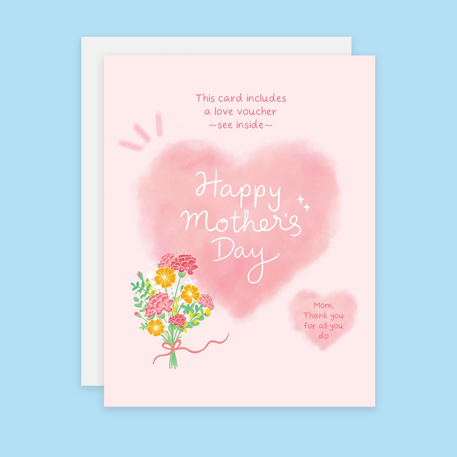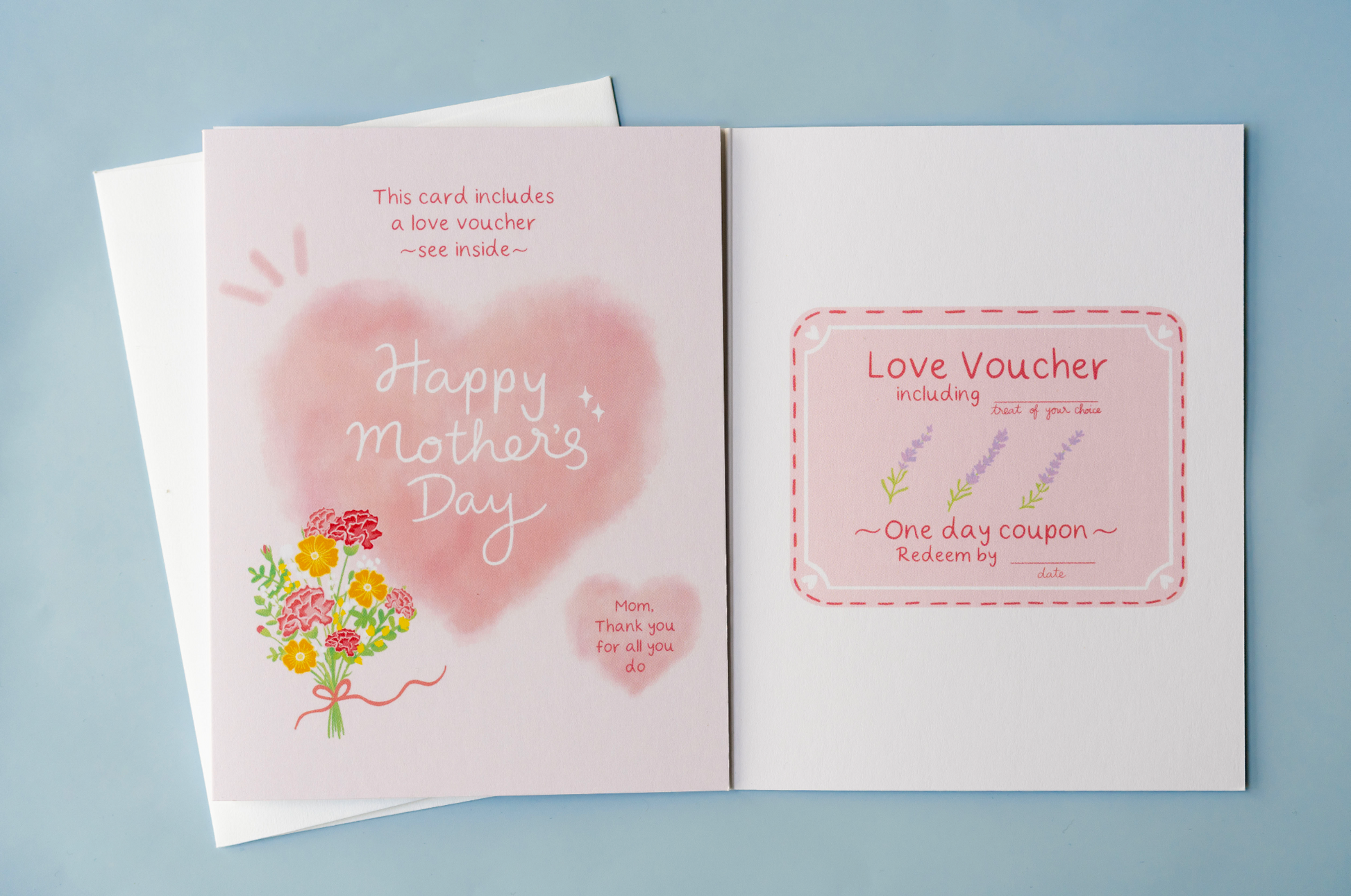 Personalize this Mother's Day Card by filling in the blank voucher with your own "treat of your choice" (i.e. home cooked meal, all house chores, shoulder massage) and the "date" for when you'd like to pamper mom on her special day!